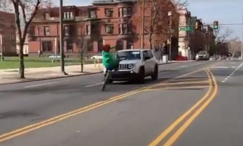 U jednom trenutku prisili su vozača Jeep Renegadea da oštro pritisne papučicu kočnice i zaustavi se. Time su ušli u novu fazu rizika jer je malo nedostajalo da se neki vozač zabije u Jeep i potom ugrozi biciklistu-kamikazu.