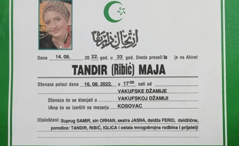 “Inna lilahi ve inna ilejhi radziun – Svi smo Allahovi i svi se njemu vraćamo. Naša najbolja supruga, majka, sestra je voljom Uzvišenog preselila na bolji svijet. Ne postoje riječi da opišu težinu našeg iskušenja. Molimo Gospodara da se i njoj nama smiluje. Amin.”