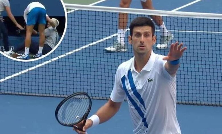 {source}<blockquote class=”twitter-tweet”><p lang=”en” dir=”ltr”>Djokovic just hit a lines person in the neck with an errant ball after losing a point. And I think he knew it. Yikes. <a href=”https://t.co/05iVUtpQ0Z”>pic.twitter.com/05iVUtpQ0Z</a></p>— thehojo (@thehojo) <a href=”https://twitter.com/thehojo/status/1302699861796630535?ref_src=twsrc%5Etfw”>September 6, 2020</a></blockquote> <script async src=”https://platform.twitter.com/widgets.js” charset=”utf-8″></script>{/source}