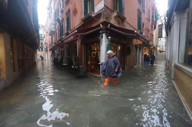 Fotografije i snimci nastali u Veneciji prikazuju stanovnike i turiste kako hodaju kroz duboku vodu i po drvenim platformama dok visoki valovi udaraju u zidove, a voda kao rijeka teče ulicama.