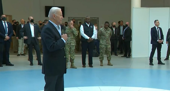 “Ukrajinci su pokazali da imaju kičmu. Pogledajte kako su hrabri… Žene, mladi ljudi, izlaze pred proklete tenkove i govore ‘ne odlazim, ostajem ovdje’. Nevjerovatni su”, rekao je Biden američkim vojnicima.